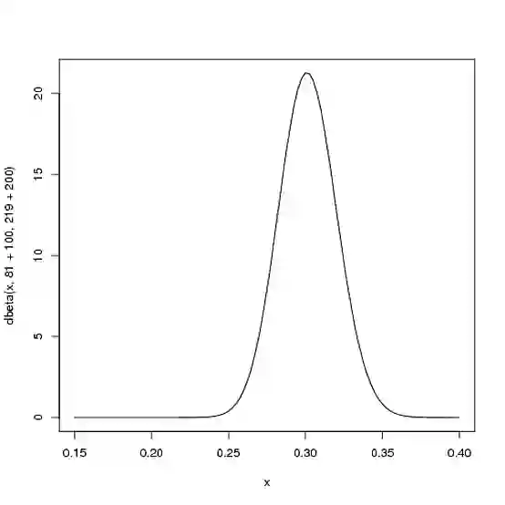 然而,随着赛季的进行,棒球手的安打数越多,曲线为了适应新证据所作的移动也会越多,而且,由于我们有更多的证据,它会收拢。比如,到赛季的一半,球手的打数达到了300,其中有100个安打。新的分布会是Beta(81+100,219+200):