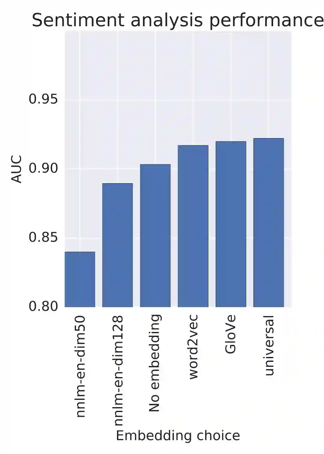 假设Tia使用的是IMDB影评数据集,从中采样了1000条积极评论和1000条消极评论。我们将用一个预训练的词嵌入将IMDB中的文本映射到低维度向量中,然后利用这些向量作为线性分类器中的特征。之后将利用一些不同的次嵌入模型,为每个模型训练一个线性情感分类器。