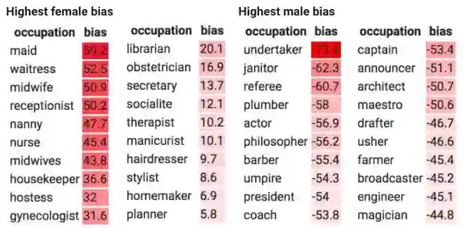 给定一个经过训练的文本嵌入模型,我们可以直接测量模型对词语或短语之间的联系。其中许多联系对自然语言处理任务非常有用。然而,有些联系可能是有问题的,甚至是有害的。例如,在Bolukbasi等人突破性的论文中,他们发现“man”和“woman”之间的向量关系与在谷歌新闻文本上训练过的word2vec嵌入中“physician”和“register nurse”、“shopkeeper”或“housewife”的关系很相似。