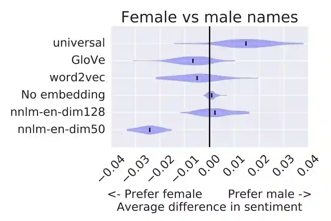 在这个例子中,她从测试数据集中选取了100条短评,然后附上这样一句话:“由_评论”,空白处填人名。她将Caliskan的“非洲裔美国人”和“欧洲裔美国人”名字以及美国社会安全局统计的最常用男女名字填入空白处后,发现了平均情感分数之间的差异。