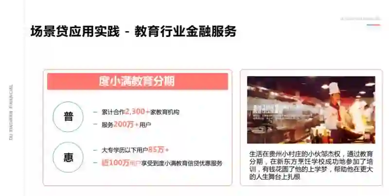 到目前为止,我们已经服务了超过两百万的用户。这些用户中,大专以下的学历的群体大约有 85 万,很多是从农村、从大山里出来的孩子,缺少相关的学历,通过我们的场景贷分析,他们能更容易获得培训与教育,从而可以更好地在城市里生活,而他们享受的利率也是很低的。在这个过程中,技术带来很大的一个核心变化,就是大大去降低人们信贷的成本,使得想实现梦想的人有机会去获得很好的金融服务,我们自身也能感觉到,我们在做一件非常有意义的事情。