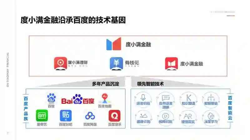 度小满金融继承了百度的技术基因。百度通过做搜索,沉淀了包括自然语言处理、语音识别、语义理解、图像识别,深度学习的经验,百度也是国内最早成立深度学习研究院的企业,在这个层面做了非常深度的积累,同时,百度又有非常广阔的产品线,和用户之间建立了很强的连接。在这个基础上,度小满才能够去开展智能金融的系列实践。