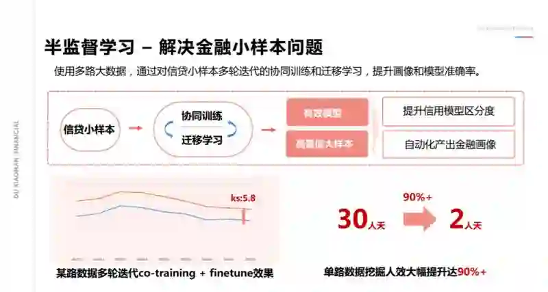 上图的左下角是一个实例。我们在某个数据上通过协同训练 + 迁移学习的方式,发现最后的单路数据的区分度取得了显著的提升,做金融的同学会知道:KS 值提升 5.8 是一个非常显著的变化,这就是技术层面带来的收益。