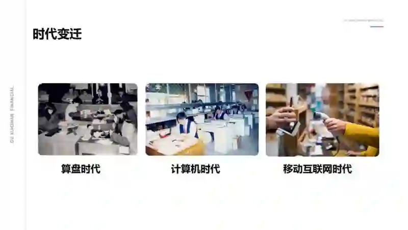 第一个时段就是算盘到计算机的时代。这个时代是建立金融的科技时代,计算机的大规模应用,大大地提升了自动化,也提升了效率;
