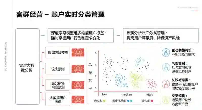 提升经营效率,首先要对企业的用户客群进行分类管理,通过实时的大数据分析以及建模,我们可以把用户的状态更加清晰的表示出来,比如说用户的风险预测,或者是否存在资金流失的风险,或者是不是现在是有新的需求产生,应该要给他提供新的产品。