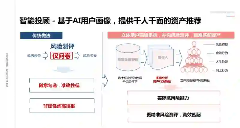 而对用户做了更加精准的风险评估之后,就可以辅助用户进行资产选择,同时也能主动的帮用户进行一些纠偏管理。比如这个用户的行为是很激进的,但是评估完他资产的承受能力,以及个人实际能够承受的的风险水平,与他真正可以承受的风险并不一致的情况下,就可以主动去帮用户去进行管理,使得他的投资能够做得更加的健康。