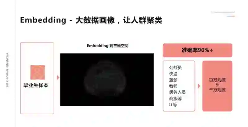 所以我们如果把用户的高维的画像 embedding 到一个三维的空间,就可以清晰地看到,人以群分的聚集效应。