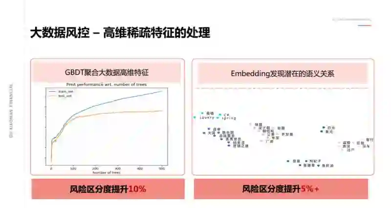 这里有两个数据。通过 GBDT,我们对高维数据进行处理,可以看到:随着树的数量增多,区分效果也是越来越明显,当然最后会趋于收敛。这样的做法在用户的信用的风险区分能力上相对传统方法有 10% 的提升度,这是一个很显著的变化。