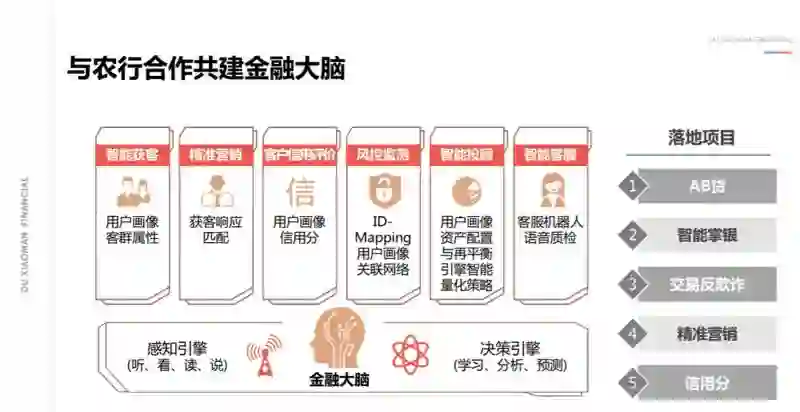 现在营业厅人越来越少,大家越来越多通过掌上银行,或者互联网方式来享受服务。我们和农业银行从 2017 年开始就共建智能金融大脑,基于金融大脑上层搭建各种各样的企业能力。