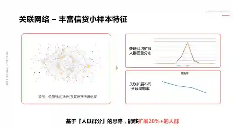 在智能金融领域,前文所讲的图关系依然存在,而且这样的图关系在更早的时候其实没能得到非常好的应用。我们尝试在图关系上进行迭代,让用户的信用进行传递,通过这种方式,我们能够扩展出一批用户群体,就如右上图所示,扩展出的这部分用户群体,他们的信用分布和扩展前的群体是相对接近和相似的,同时,从风险表征上去看,它的风险也能表现出很好的区分度。