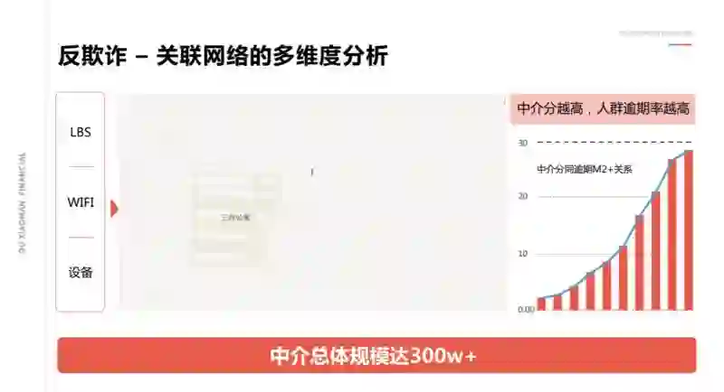 除了用前面的区分技术对用户有很好的理解区分以外,场景贷面临最大的一个挑战是来自于机构的欺诈风险,尤其是群体型欺诈。
