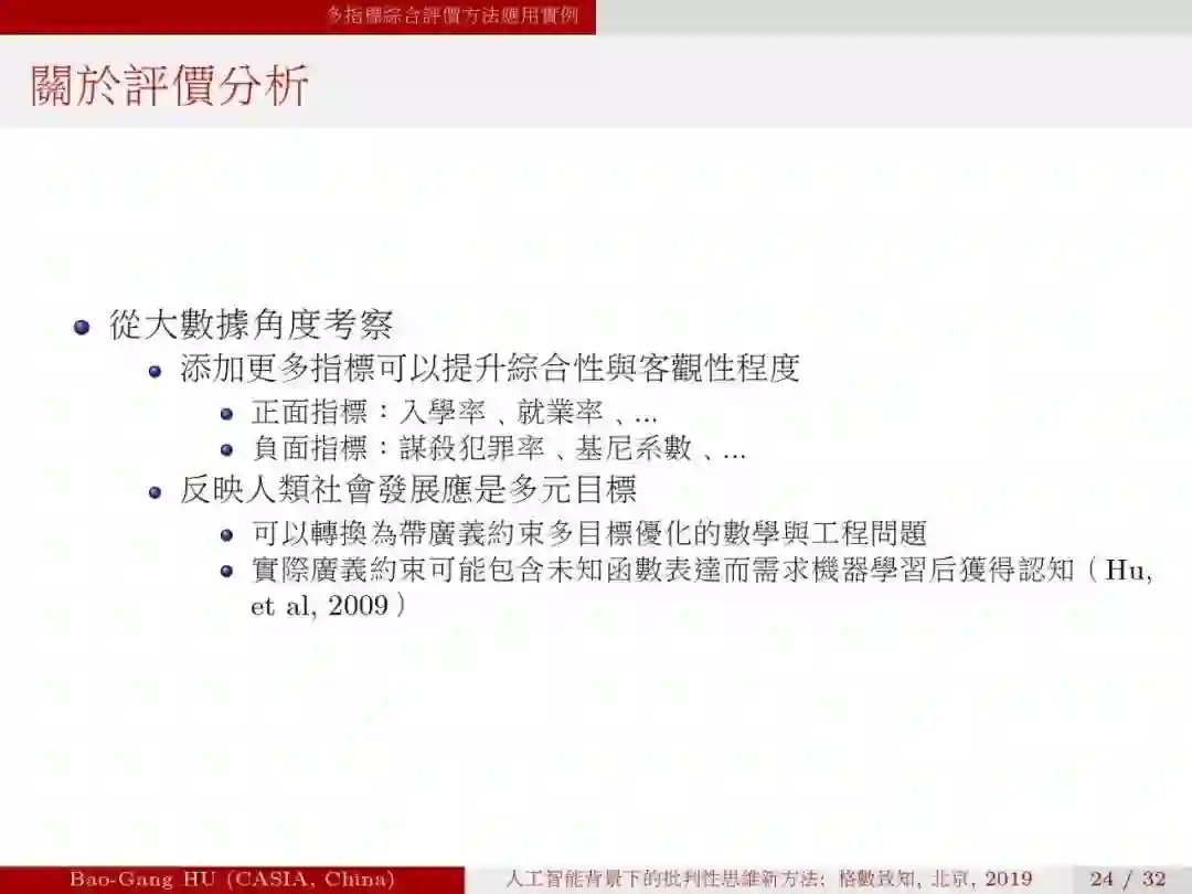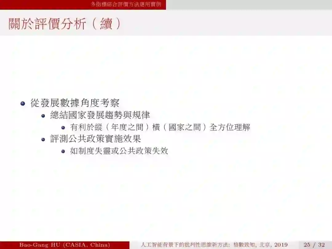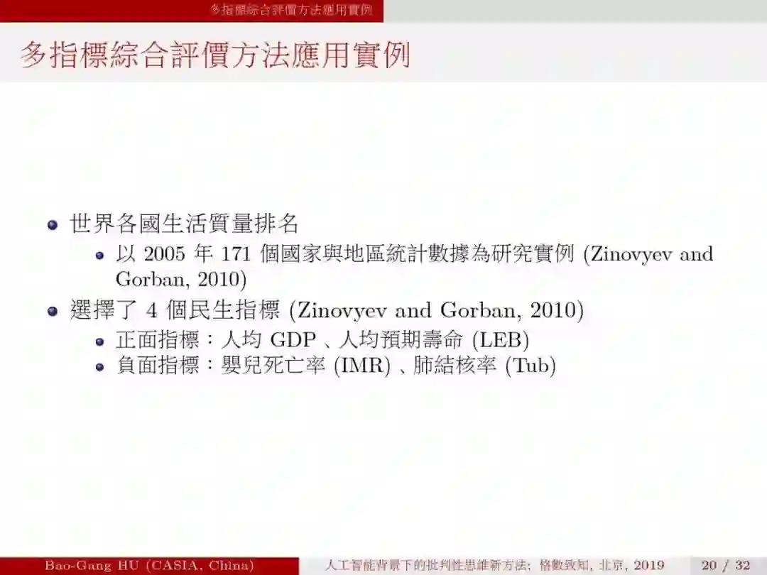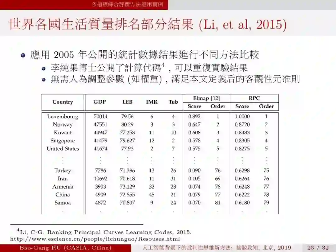 本讲稿强调了一种“格数致知”方法。其中给出了一个实例是多指标综合排名世界各国生活质量。这是典型的无标准答案的评价分析问题。目前国际学术界或机构多是常规方式采用加权平均方法实施此类分析。有关分析将有助于我们以数据方式了解真相与问题。让数据,事实,时间,与逻辑说话也是批判性思维中追求客观性的基础。