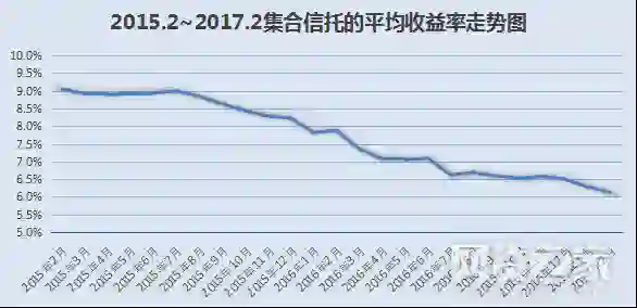 在13年时候收益率能够达到16-18%,16年却跌破7%。随着市场逐渐饱和,基建和房地产逐渐成熟,信托市场资金供需平衡,使得收益率腰斩,红利不再,我们来看看15年到17年两年之间信托的收益走势,一路下跌。