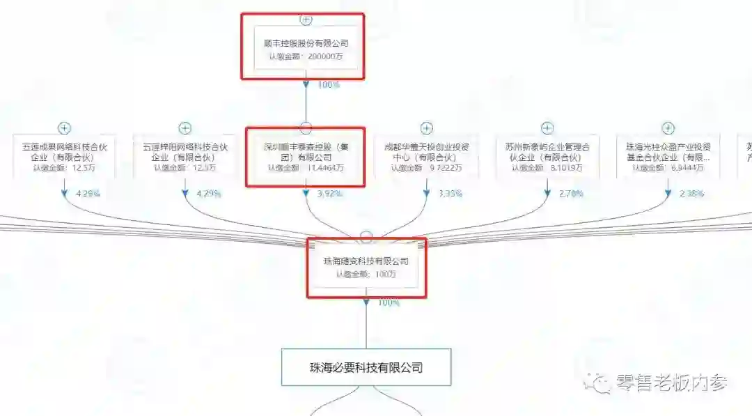 《零售老板内参》通过企查查了解毕胜名下的“珠海必要科技有限公司”股权穿透图时发现,顺丰控股旗下的深圳顺丰泰森控股(集团)有限公司,占据必要商城3.92%的股份,认缴金额为11.45万元。据知情人士透露,王卫是想通过必要商城,再造顺丰商业的另一只抓手。