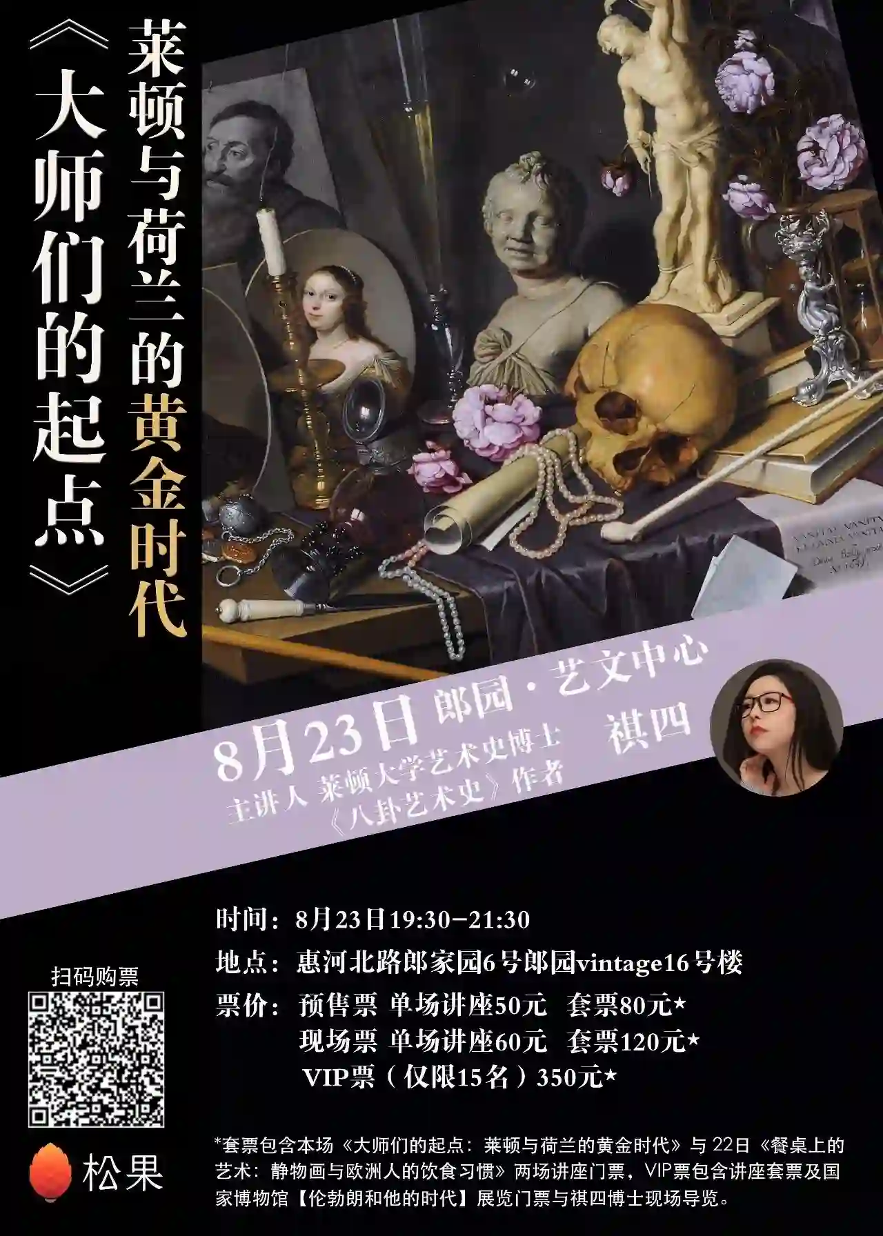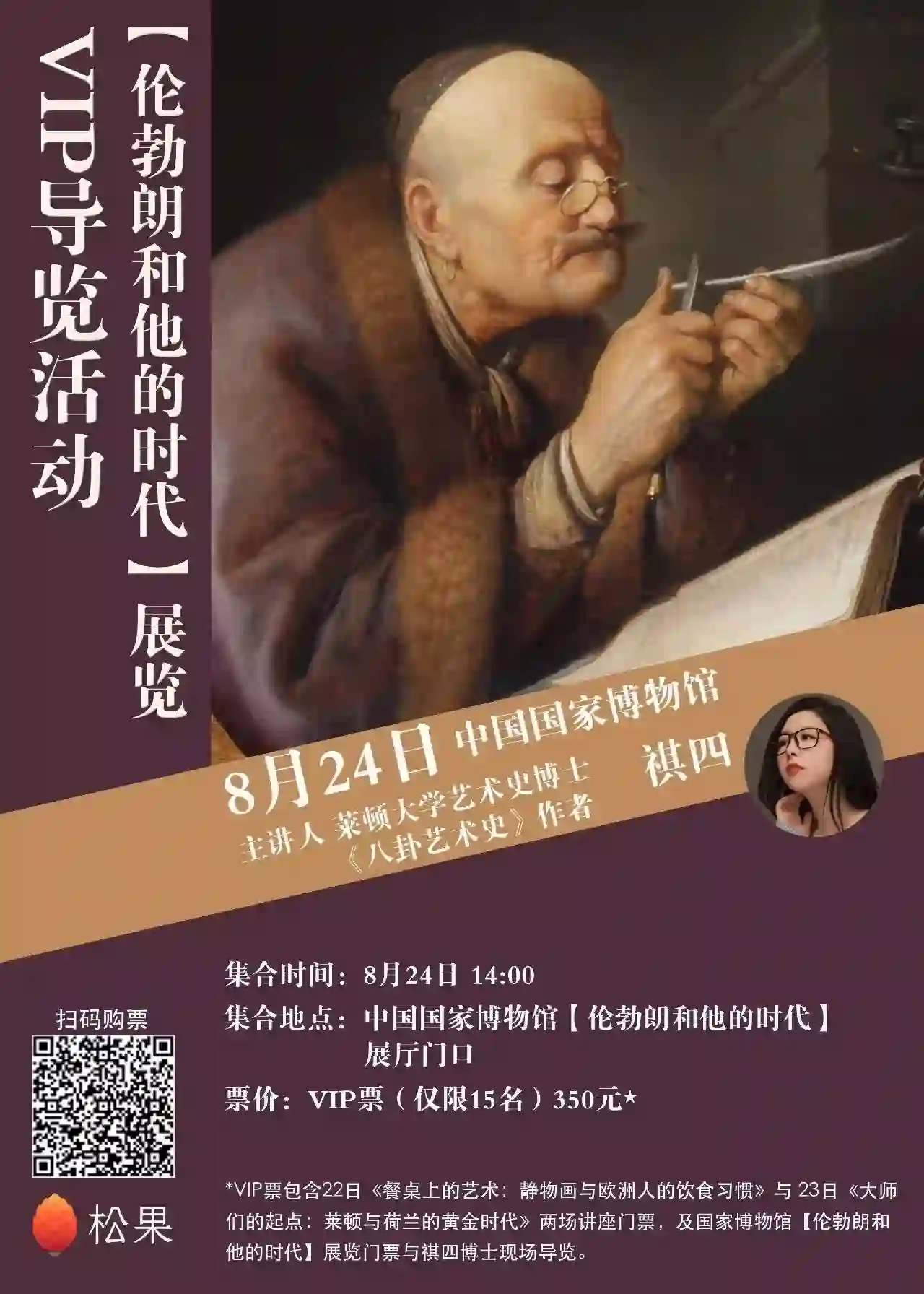 VIP票 (仅限15名)350元,包含两场讲座套票+中国国家博物馆《伦勃朗和他的时代》展览门票一张(价值50元)+祺四博士现场专属VIP导展