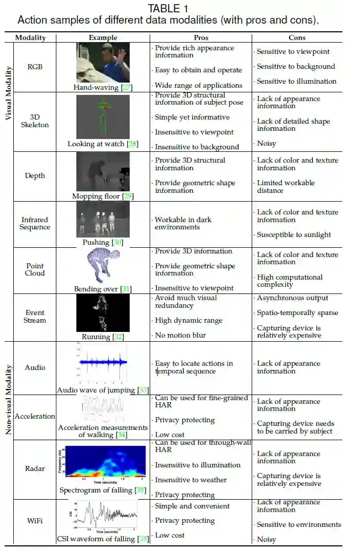 人类行为可以使用各种数据模态来表示,如 RGB、骨架、深度、红外序列、点云、事件流、音频、加速信号、雷达和 WiFi,这些数据模态在不同的场景下具有不同的优势。本文研究者