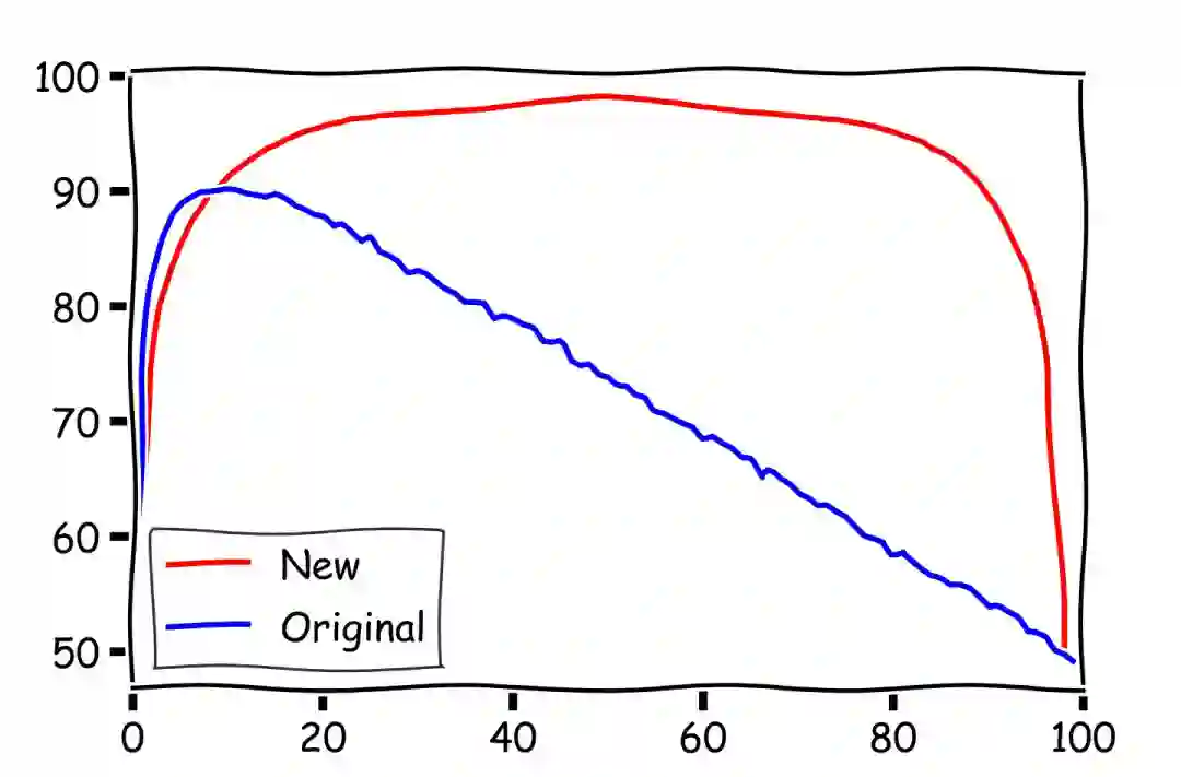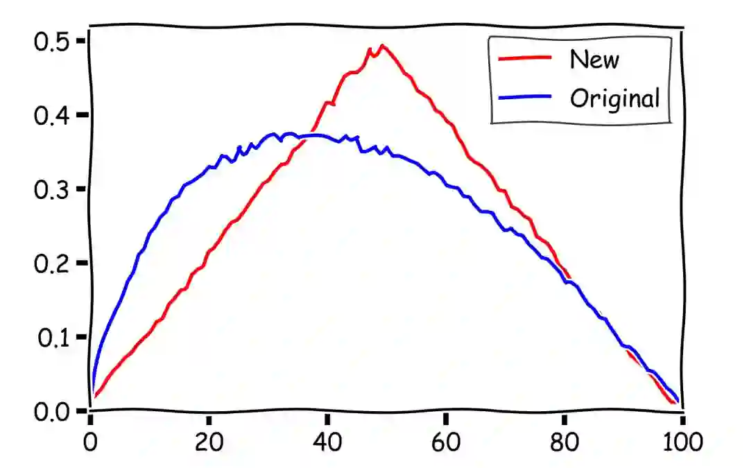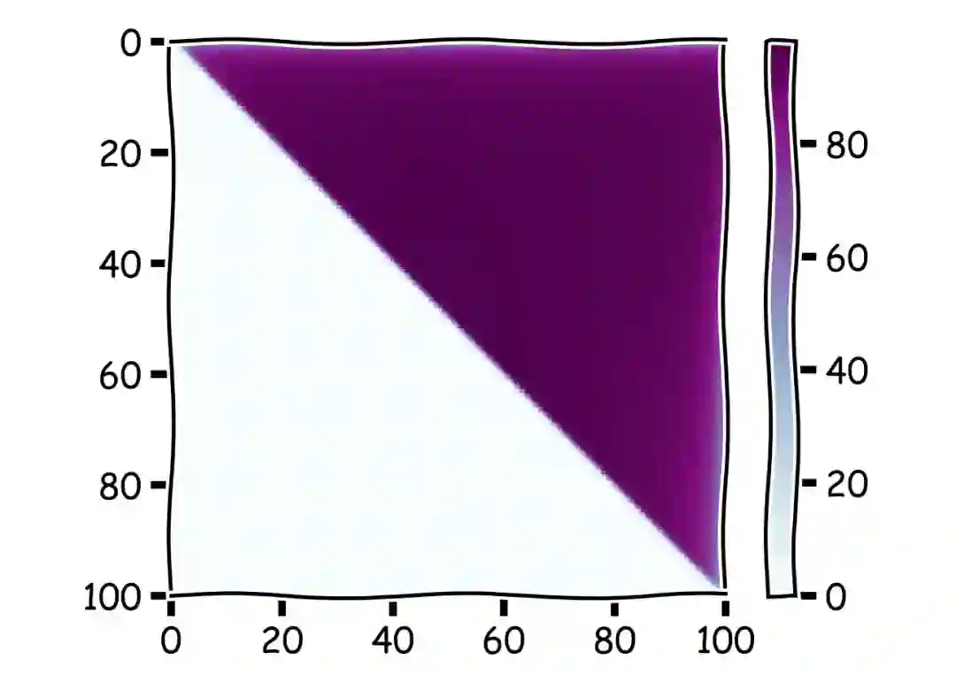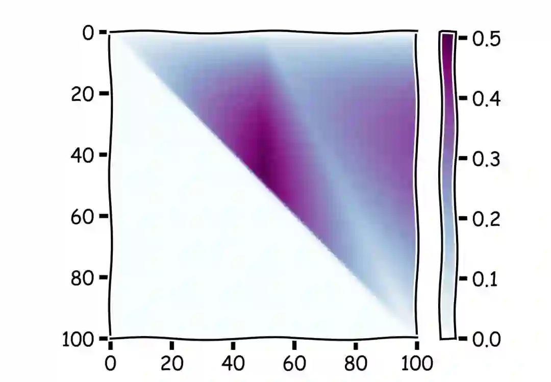 为了直观了解两个策略哪个更强,我们人为地随机生成了 10000 个长度为 100 的序列进行模拟,按照原来的 1 / e 策略和我们的吃回头草策略从序列中找出最大值。下图中横轴为 k 的取值,也就是选择的终点,到达这里以后就不再继续看新的选项了。纵轴为 r 的取值,在一开始需要拒绝的选项的数量。因为我们选择的终点显然要大于需要拒绝的数量,所以在我们的结果中只展示了上面半个三角形的部分。图中颜色的深浅代表了在这个参数下取到最大值,捡到最大的麦穗的可能性。