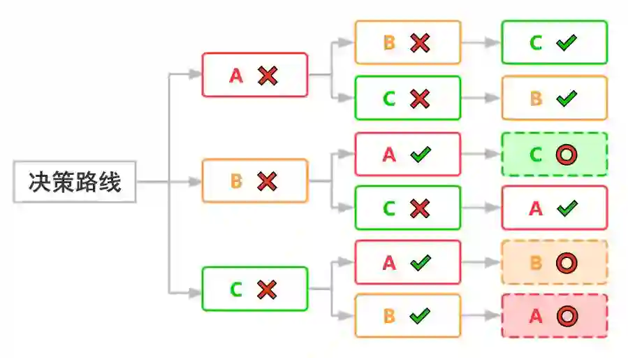 选麦穗策略示意图,假设 A > B > C,我们拒绝掉最开始的第一个,那么会有一半的概率选到整个序列中的最大值。