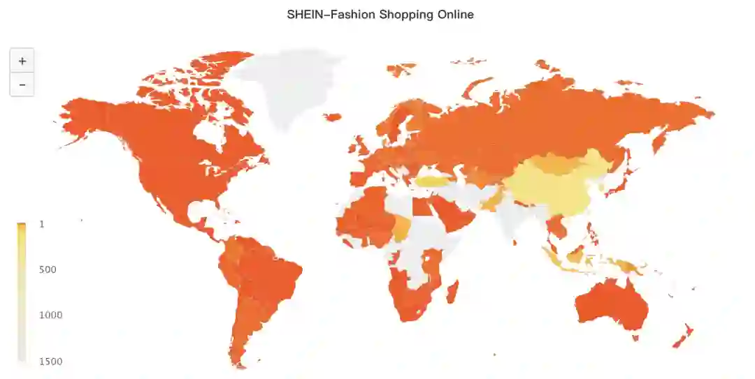 SHEIN在52个国家中购物榜第1,在83个国家和地区中排名前10,这是什么概念?相当于中国的淘宝、拼多多。