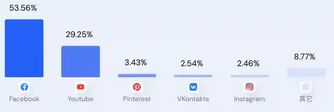 我们对SHEIN的社交媒体进行细分,可以看到Facebook的流量占到53%,是最多的流量渠道,其次是Youtube,接近30%,Facebook、Youtube这两个社交媒体就占到了83%以上。其他就是Pinterest、INS等渠道。