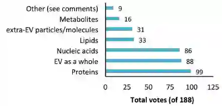 这一结果显示目前大部分人认为我们如此关注细胞外囊泡RNA和细胞外RNA是合理的。也可以看到,目前细胞外囊泡相关RNA以及细胞外RNA的研究相比其他成分有更多的报道,另外目前处于研发阶段或已经上市的临床相关产品中细胞外囊泡相关RNA和细胞外RNA的产品也更为常见。但这些也可能是由于目前技术发展不均衡所导致的,应该指出的是,目前核酸的检测和测序技术十分发达和先进,但是对于蛋白、脂质等成分的检测和分析技术还需要长足的发展。