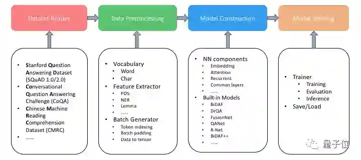 搜狗将机器阅读理解任务的流水线分解为4个步骤:数据集读取、预处理、模型构建、训练和评估,对每步都进行了抽象和模块化,以简洁的接口呈现。