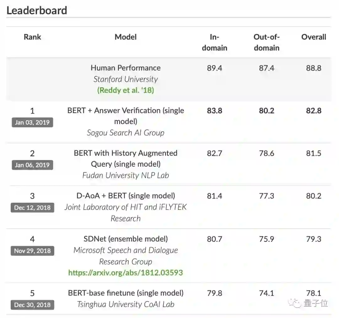 今年1月,搜狗凭借BERT+Answer Verification(单一模型)登上CoQA榜单第一名,超过了国内外众多知名研究机构和高校,如微软、讯飞、清华、复旦,斯坦福等等。