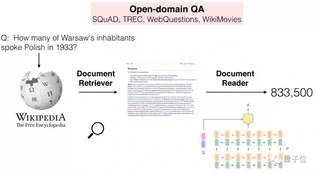 所谓开放域问答(open-domain question answering),是指在给定任意类型的问题后,从任意资源中取得答案。越来越多的开放域问答方法采用机器阅读理解技术生成答案。