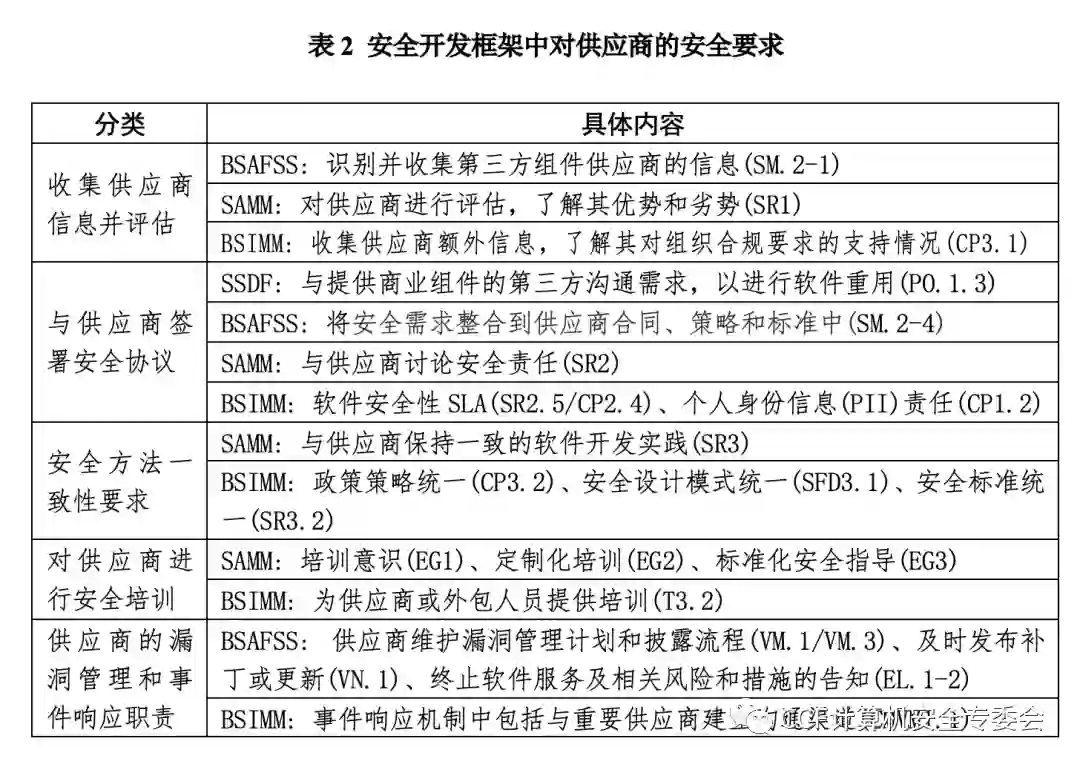 小结:多个框架都要求对供应商进行评估和签署安全协议;BSIMM对供应商的要求最为全面,涉及所有5个方面;上述这些对供应商的要求贯穿于软件开发生命周期的全过程,在安全层面将供应商与组织捆绑在一起。