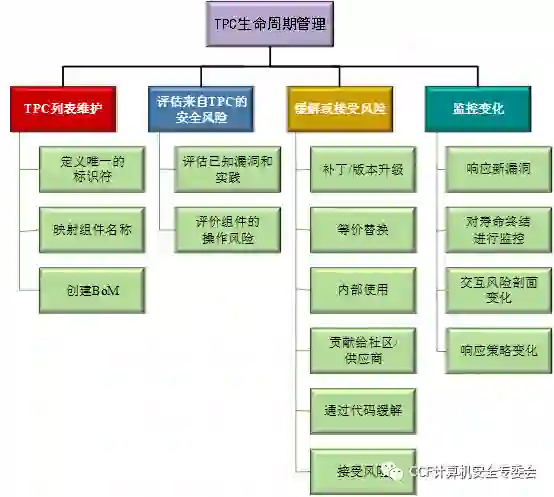 SAFECode安全软件开发基本实践将第三方组件安全风险管理(TPC)作为单独一部分进行系统描述。TPC管理共有4个步骤:TPC列表维护、评估来自TPC的安全风险、缓解或接受风险、监控变化,每个步骤又包含若干具体措施,如图1所示。