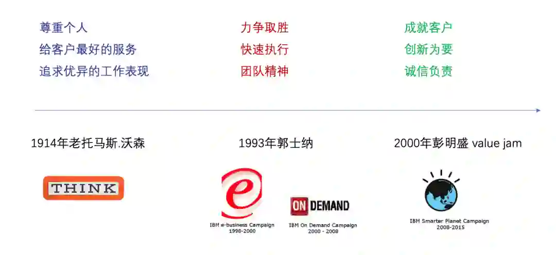 再来看看IBM的价值观,现在是创新为要、成就客户、诚信负责。不过,在IBM的百年发展中,价值观演变也经历了三个阶段。