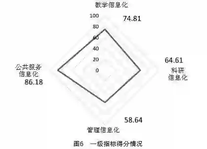 基于最终确定的指标体系,对湖北省某高校实施教育信息化应用水平的调研。经过研究分析,该高校教育信息化综合应用水平一般,其在各一级指标的得分情况如图6所示。