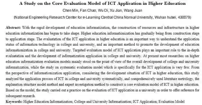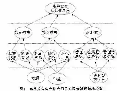 本研究综合运用了文献计量法、解释结构模型和专家调查等方法,通过挖掘高校教育信息化应用的核心要素及其关系,提出了一个针对高校教育信息化应用的核心评估模型。