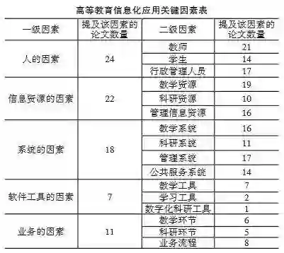 从二级因素可以看出,超过5篇以上被提及的因素有14个,分别是教师、学生、行政管理人员、教学资源、科研资源、管理信息资源、教学系统、科研系统、管理系统、公共服务系统、教学工具、教学环节、科研环节、业务流程。