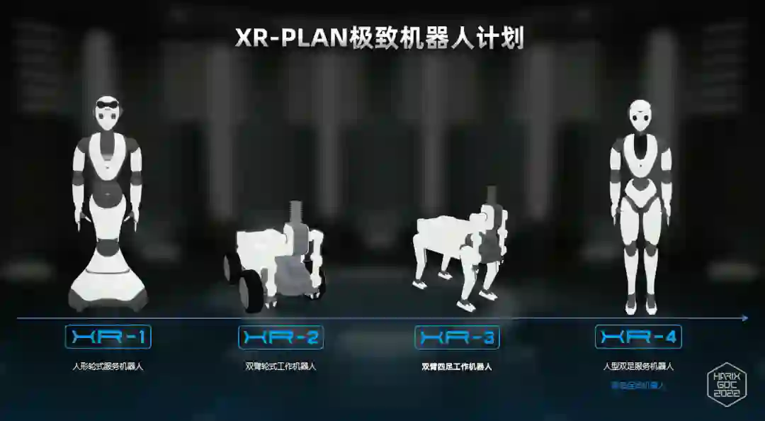 基于PC和智能手机的历史经验,达闼对未来服务机器人的标准化进行了前瞻考虑,基于应用多样性的考虑,2018年达闼启动了「XR-Plan」计划,从4个不同的分类,为智能服务机器人设定了标准:XR1 人形轮式服务机器人,XR2 双臂轮式工作机器人,XR3 双臂四足工作机器人,XR4 人型双足服务机器人(家庭保姆机器人),为各行各业的客户提供标准化的产品和场景,达闼云端机器人已在安保、巡检、看护、清洁等场景中,得到广泛应用。