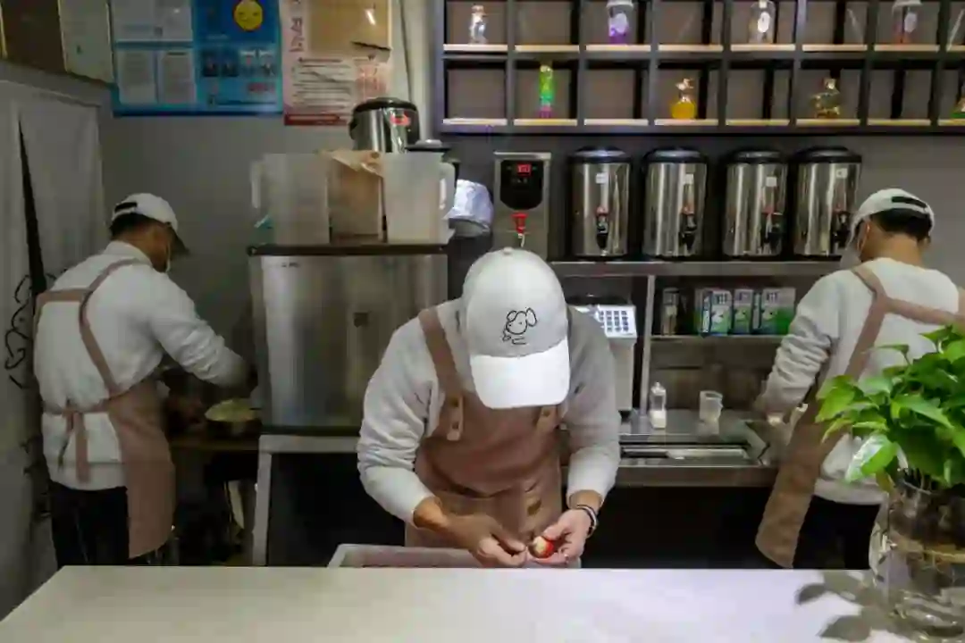 几个员工挤在一间不足十平米的奶茶店时而协作,时而各忙各的。虽然工作并不难,但需要极强的专注力和配合度,所以招聘的员工很少有超过三十岁的,吴立才新来这家书易两个月不到,“我连公司微信群都还没进。”
