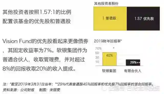 这种结构确保了给软银集团带来巨大的回报的强劲基金业绩。到目前为止,一切运作良好。在截至3月31日的财年中,该基金为普通股股东创造了45%的回报率;为有限合伙人创造了29%的混合回报率,其中包括优先股最高7%的回报率;为软银集团创造了62%的回报率,因为其收益更多集中两方面——普通股收益和管理费及业绩提成。