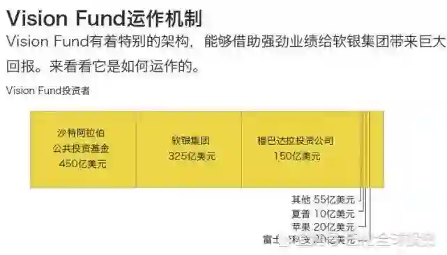 愿景基金背后是一个小规模投资者群体,合计出资1030亿美元。包括来自沙特阿拉伯公共投资基金的450亿美元和来自阿布扎比的穆巴达拉投资公司的150亿美元。规模较小的投资者包括富士康科技(2354,台湾)、苹果(AAPL)、高通(QCOM)及夏普(6753,日本)。软银自己出资325亿美元。