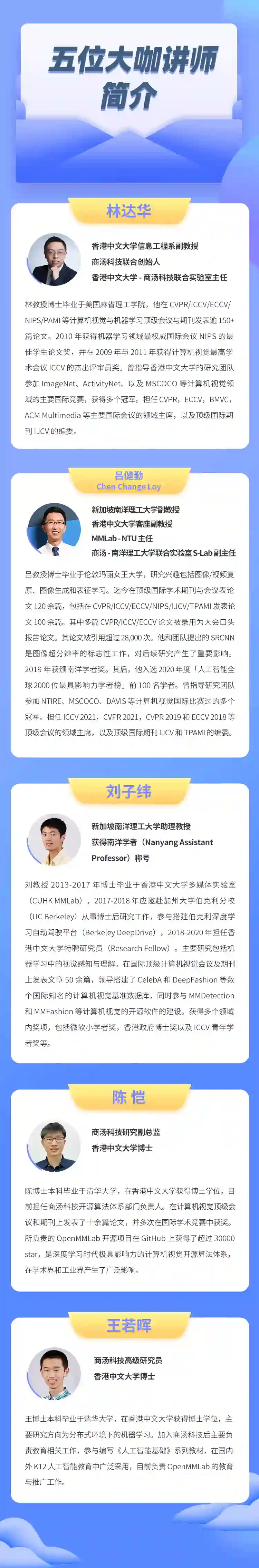 届时,多位在计算机视觉领域享誉海外,来自世界顶尖高校和企业的老师和教授,将逐一详解图像分类、目标检测、语义分割、底层视觉、视频理解等计算机视觉最核心、最基础的技术方向,并基于OpenMMLab的一系列工具,提供算法模型从理论到实践的指导。