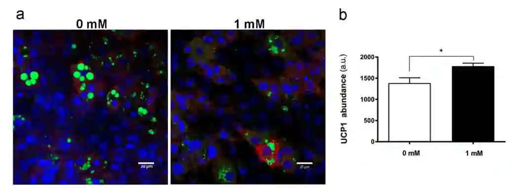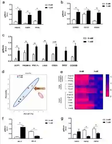 研究人员将干细胞衍生的脂肪细胞暴露于咖啡因,发现UCP1的含量明显增加,细胞基础呼吸增强,耗氧量增多,代谢加速。同时,咖啡因还增加了糖酵解和氧化磷酸化,上调了棕色脂肪组织相关基因的表达,极大刺激了棕色脂肪组织的活性。