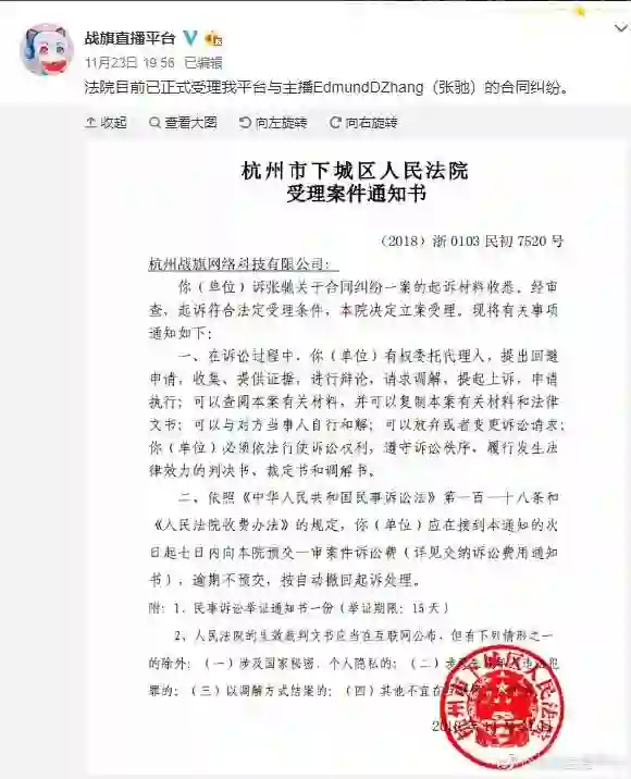 【TechWeb】11月24日消息,昨晚,战旗直播在官微发布消息称,已就合同纠纷起诉前主播EdmundDZhang(张驰),法院已经受理,并附上了法院受理的通知书。