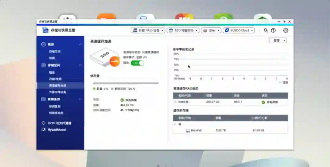 第二种是把 SSD 当作 HDD 的缓存加速,可以让 HDD 的读写速度得到一定的提升,在存储池这里可以看到一个闪电的标志。