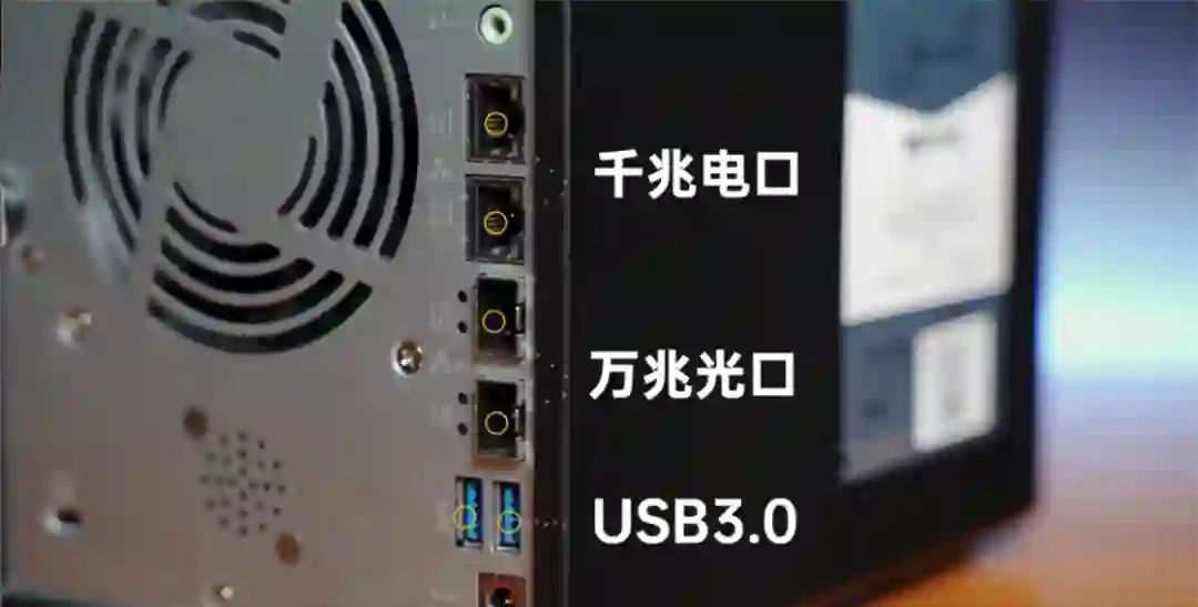 机身背部除了两个千兆电口和两个 USB 3.0 口。就是我最关心的两个万兆光口了,用它配合 QNAP 自家的雷电 3 转万兆转换器,就能在我的 MacBook Pro 上,实现最为简单的万兆内网的建设。