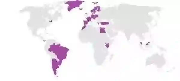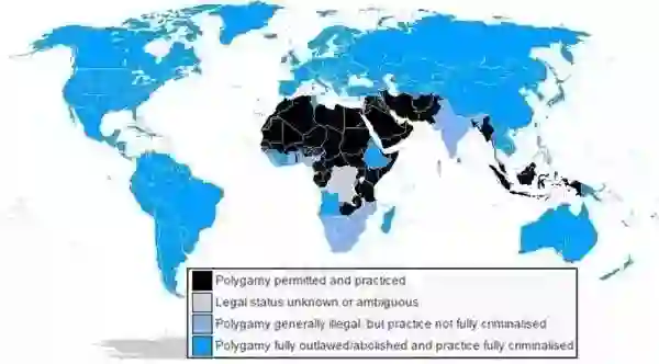 全世界的一夫多妻现象分布(黑色区域:一夫多妻合法;灰色区域:未知;浅紫色区域:虽然一夫多妻一般认为非法,但其实不会受到严格制裁;蓝色区域:一夫多妻非法,且该行为会受到法律制裁)
