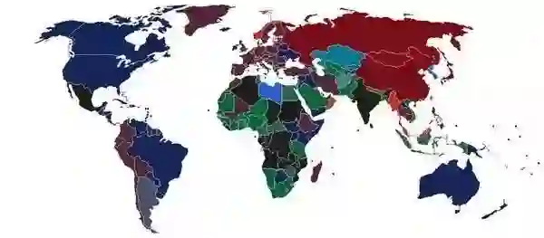 世界各国的道路通行方向(蓝色代表靠左行驶的国家和地区,红色代表靠右行驶的国家和地区)