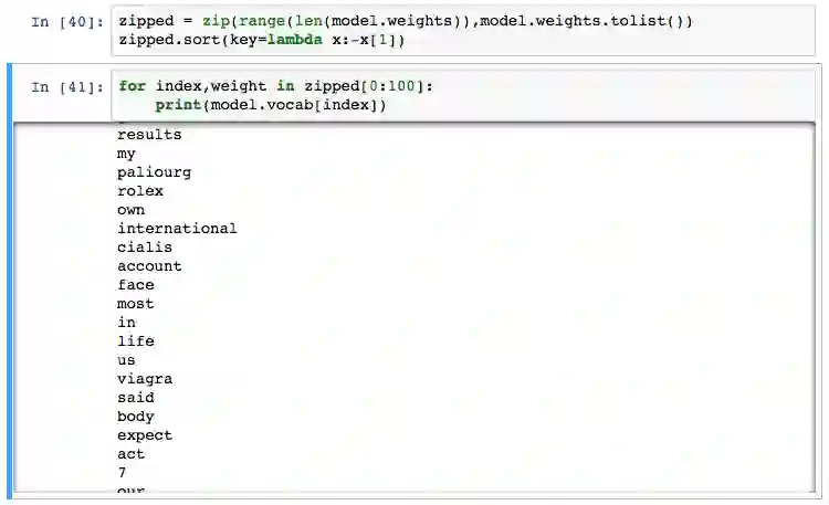 特性:可审计性 这个分类器有一个很棒的特性,它是一个具有高可审计性的算法。它不仅给出了测试数据上的精确评分,我们还能打开它,看看它给不同词汇的权重有何不同,以确保它基于Bob长官所需标记垃圾邮件。基于这些洞见,Bob长官可以从他的上级那里得到对辖区内的客户端进行极为有限的监控的许可。注意,Bob无法阅读任何人的邮件,他仅仅可以检测他需要检测的目标。