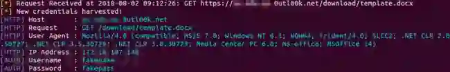 在C2服务器上,我们观察到Phishery收到了入站请求并获取到了凭证,如图7所示。具体来讲,当我们打开DarkHydrus的Word文档时,C2服务器能够获取到我们在身份验证对话框中输入的“fakename”和“fakepass”。