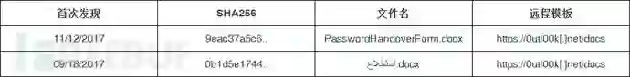 我们利用0utl00k [.]net域找到了另外两个用于窃取凭证的Word文档,如表1所示。我们首次发现这两个文档的时间分别是在2017年9月和11月,这表明DarkHydrus几乎一直在进行这种凭证窃取活动。
