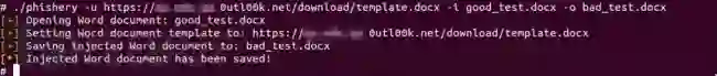 我们利用Phishery创建了一个用于测试的文档,并使用了图4中的远程模板URL。图5展示了这个过程,Phishery能够将这个URL注入到我们所创建的名为“good_test.docx”的文件中,我们将生成的文件保存为“bad_test.docx”。
