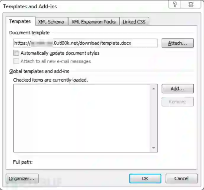 如图1所示,在验证对话框上有这样一行文字“Connecting to <这里对域名进行了屏蔽>. 0utl00k[.]net”,它实际上是DarkHydrus的一个C2服务器。如果用户在此对话框中输入了自己的凭证并按下“OK”按钮,凭证则将通过URL https://< 这里对域名进行了屏蔽>.0utl00k[.]net/download/template.docx发送到这个C2服务器。在验证对话框消失之后,Word文档将呈现它的内容。在我们展示的这个样本中,它的内容是空白的。